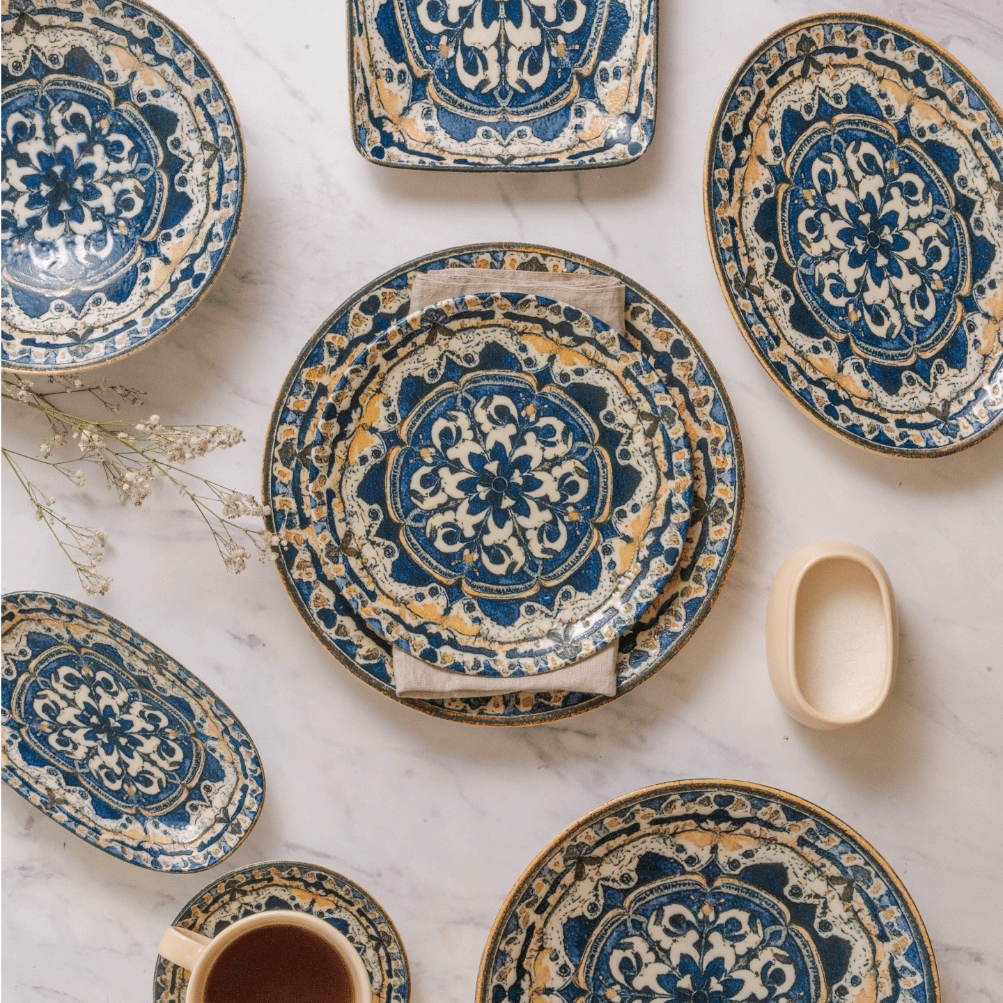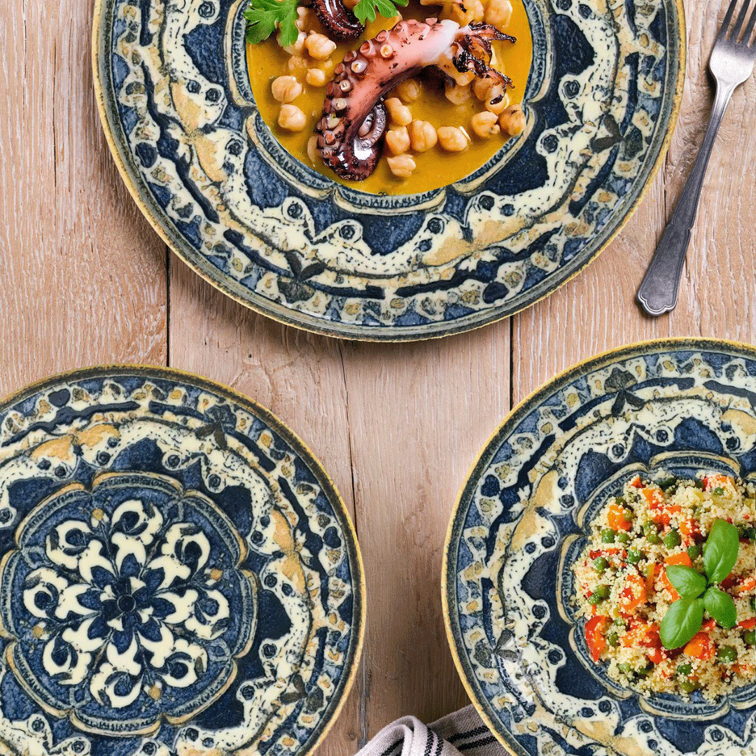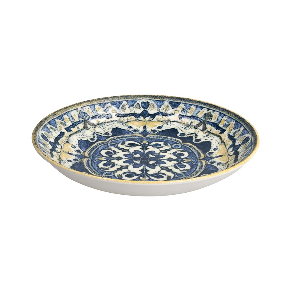 Bloom Granada porslinsserie är ett trendigt porslin i Horeca kvalitet med moriska influenser från Alhambra i Granada, Spanien. Insidan har en strukturerad glasyr i nyanser av vitt, blått, gult och grått och utsidan är blank vit. Bloom Granada ger liv till din servering och blir ett vackert och färgglatt inslag, perfekt att kombinera med vitt, gult eller blått porslin.