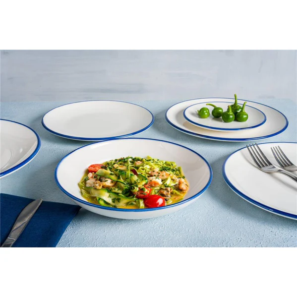 Linea porslinsserie Blue från Bonna har blåa handmålade kanter, som kompletterar porslinets eleganta utseende. Perfekt för restauranger och caféer i sommarsverige som vill ha en maritim atmosfär. Den blå randen tar upp havets och sjöarnas blåa spegel. Linea är stapelbar är mycket motståndskraftig mot repor, stötta kanter och plötsliga temperaturförändringar. Tillverkat i Bonnas blanka premium porslin. Linea finns även med svart och vinröd (Burgundy) handmålad kant. Effektfullt att blanda de olika färgerna.