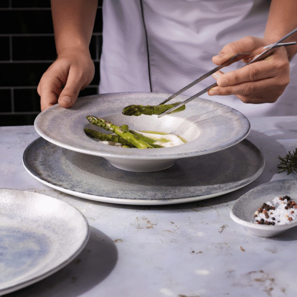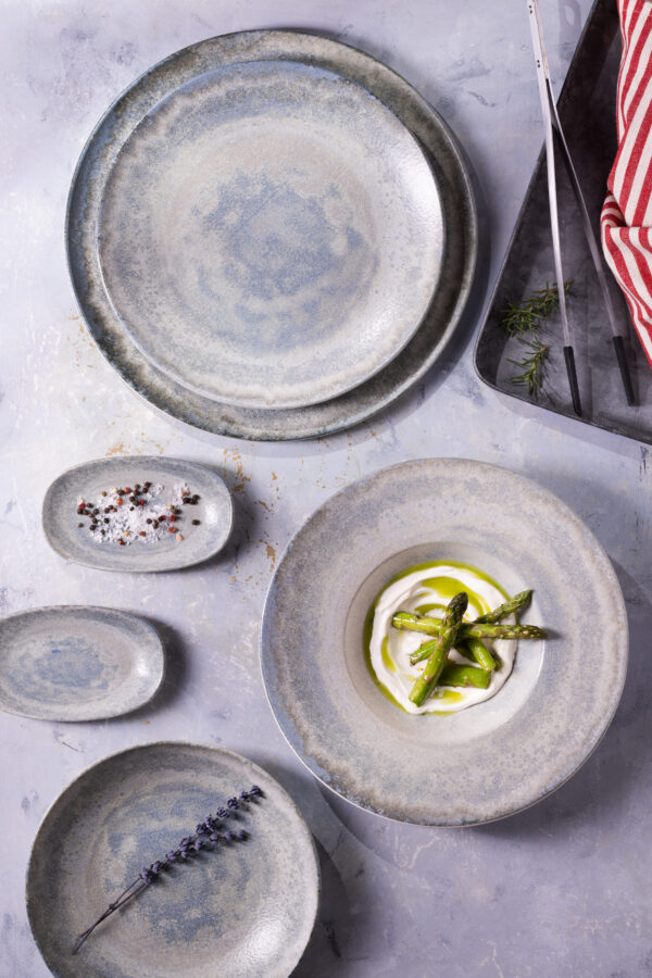 Omnia porslinsserie är utformad för att ge en personliga touch från huvudrätter och desserter. Designen är inspirerad av naturens långvariga interaktionen mellan vatten och betong. Mönstret i gråa toner är texturerat och hämtat från digital tryckteknik som ger designen en ny touch.  Omnia är tillverkad av Bonna i ett premium porslin och är fin att kombinera med Luz porslinsserie då “betongen möter jorden”. Kombinera med Montreux och Durban svarta bestick eller Durban och Baguette Vintage.