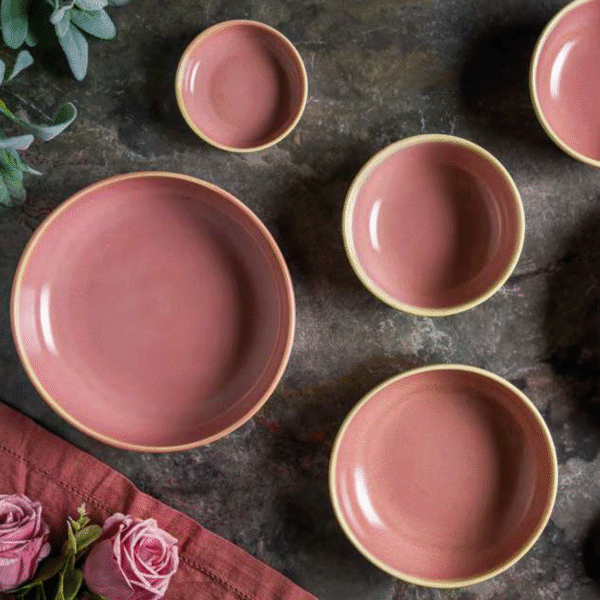 Pot bowls rosa porslinsserie. Pot bowls är nya och trendiga tallrikar designade för moderna kök. Den mångsidiga serien passar utmärkt för servering av alla typer av maträtter. Den finns i färgerna terra, rosa och vit. Färgerna och storlekarna är vackra att kombinera tillsammans. Den rosa har också reaktiv glasyr som ger vackra skiftningar i tallriken. Den vita är stilren och vacker. Terra-serien sätter maten i fokus och skapar njutbara och närvarande presentationer. Används i Kockarnas kamp. Högsta kvalitet från Bonna.