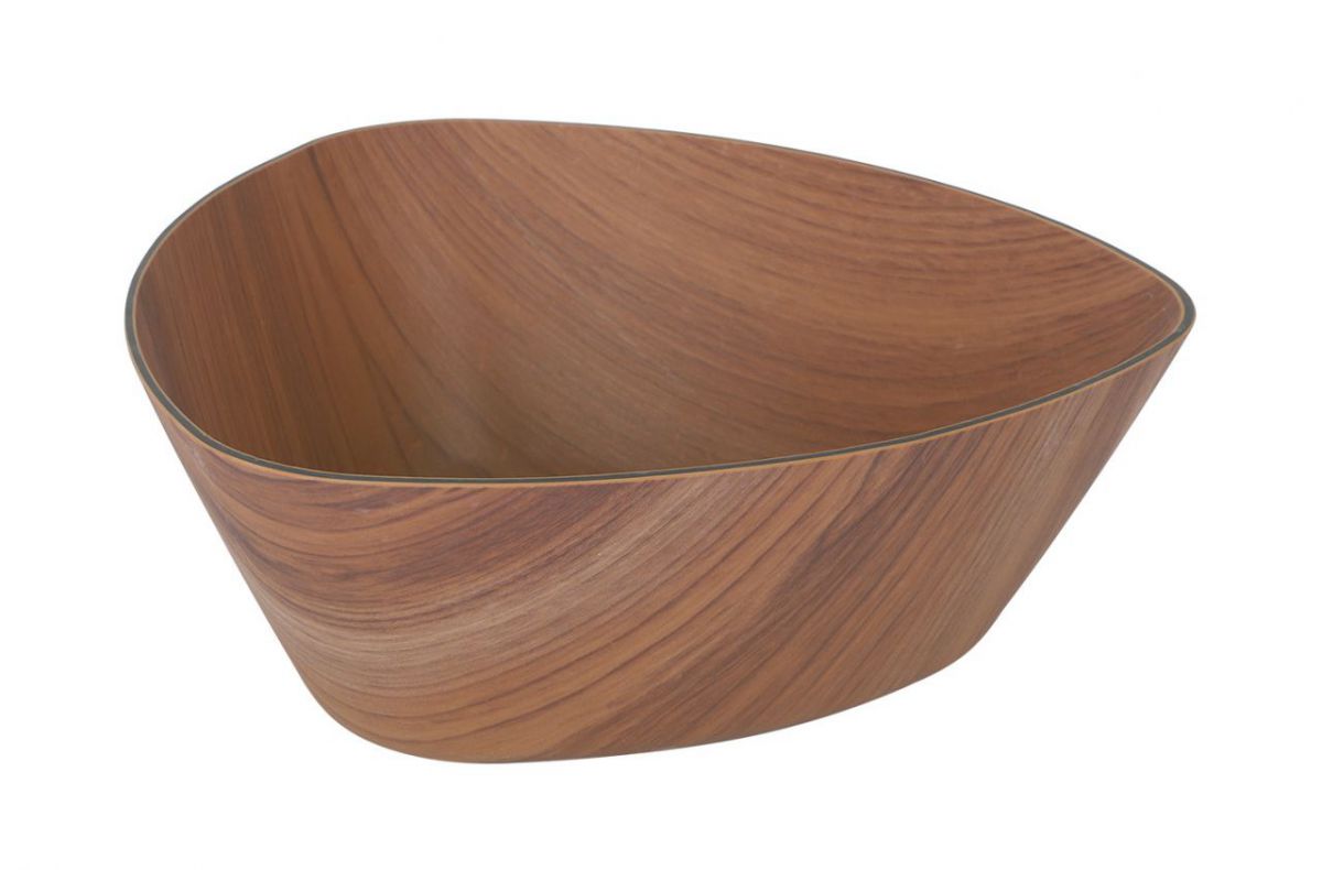 Salladsskål Woody är trekantig i trämelamin från Casteroli, som liknar akacia. Skålen är trendig och stilfull och passar både som enskild servering av en sallad och sharing. Woody är tillverkad i polystyrene, som är återvinningsbar och säker för mat. Hållbar och perfekt för uteserveringar, bufféer. Det finns fler skålar och brädor i serien som Good Mood kan ta hem på beställning. Woody finns även i svart träimitation.