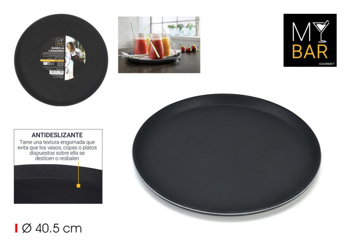 Serveringsbricka Non Slip är en klassisk bricka för servering av drycker och mat. Brickan är svart med en yta som gör att glas och porslin står stadigt. Finns även i en större modell på 45 cm.