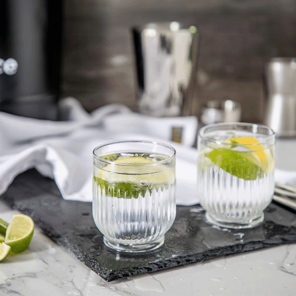 Tokyo barglas/vattenglas. Coola barglas som verkligen framhäver drycken med ränder. Passar även som vattenglas och matchar randiga vinglas, b l a Glasserien Exclusiva. Från LAV Horeca.