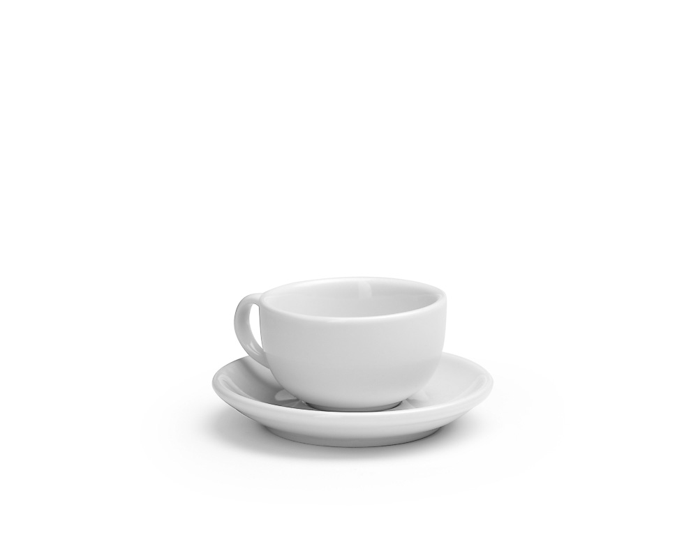 Vit Espressokopp med fat. I hållbart fältspatsporslin från Mayfair. Finns också en cappuccionokopp.