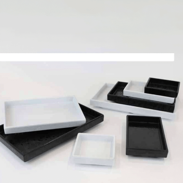 Vita melaminfat Gastronorm med rak kant Lothanza i fyra storlekar: GN 1/1, GN 2/4, GN 1/2 och GN 1/3. Höjd 1,5 cm. Med ett diskret dekorativt vitt mönster ton i ton. Finns även i svart.